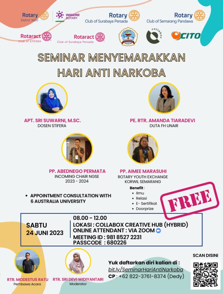 Dalam rangka Hari Anti Narkoba Rotaract Club of Surabaya Persada (asuhan Rotary Club of Surabaya Persada) dan Rotaract Club Stifera (asuhan Rotary Club of Semarang Pandawa) mengadakan seminar dengan beberapa narasumber.
